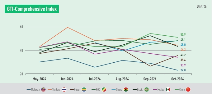 In contrast, the markets of wood producers were still in decline. The GTI indices for the Republic of the Congo (48.1%), Ghana (48.0%), Thailand (44.2%), Brazil (43.2%), Gabon (35.4%), Mexico (33.9%), and Malaysia (22.8%) were all below the critical value of 50%, indicating that in these countries, the overall business prosperity of GTI participating enterprises shrank from the previous month. However, in the African countries (Gabon, Ghana, and the Republic of the Congo), the contraction in the timber sector had eased, and it's worth noting that in the Republic of the Congo, the timber market was showing signs of stabilization on both supply and demand sides.