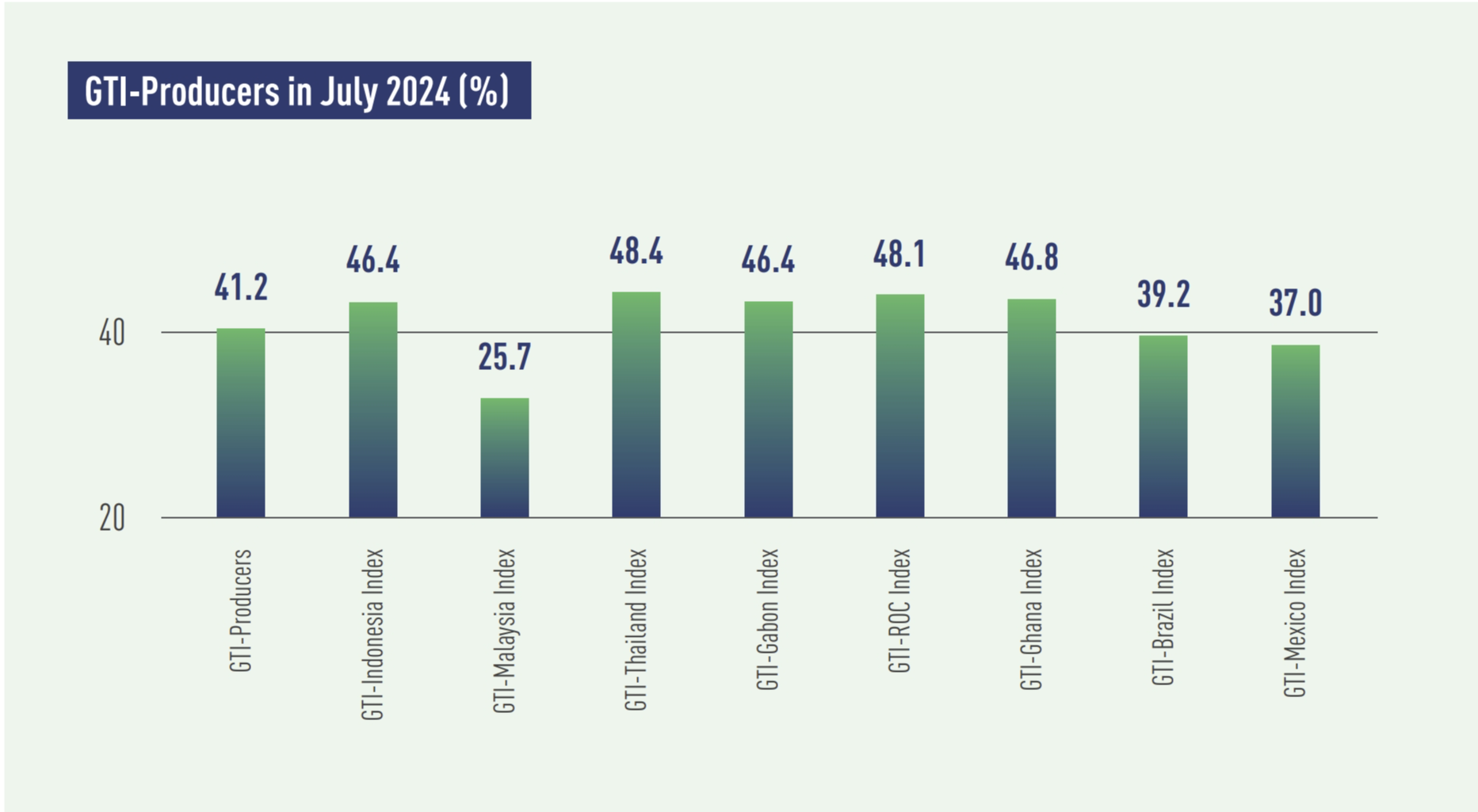 In July 2024, the GTI-Producers registered 41.2% and had stayed below the critical value (50%) for three consecutive months, indicating a continued downturn for the overall prosperity of the timber harvesting and primary processing industries in the pilot producing countries.